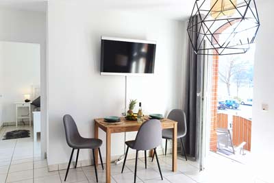 Balkon mit Essplatz und 2 Sonnenliegen.